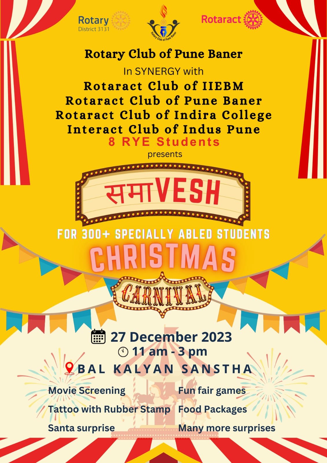 समाVESH, was jointly conducted by Rotary club of Pune Baner, Rotaract club of Pune IIEBM, Rotaract club of Pune Baner, Rotaract Club of Indira College, Interact Club of Indus Pune. Eight international students of Rotary youth Exchange, from various countries, were also part of the program. In this four- hour program, समाVESH, the especially abled children at BKS were treated to an afternoon Christmas carnival full of games and surprises. As the children entered the venue at 11.00 am, a surprise cake from Santa Claus greeted them. This was followed by various events like a ring game, tattoo stamping, throwball from a clown's mouth, breaking a tower of glasses, throwing ping pong balls in tumblers, etc. Says Rotarian Prreeya Karria, the Youth Director of Rotary Club of Pune Baner, Co-director (District) Rotary youth exchange avenue and the program convenor, "This program is valuable because it underlines the Rotary values of Diversity, Equity and Inclusion. The highlight of the carnival was the screening of Hindi film Chillar party, which the special audience enjoyed a lot. The event brought about happiness, cheer and bonding amidst the students." More importantly, since this event was conducted by the youth from rotaract, interact and RYE, it enabled a seamless mixing up of the privileged youth of society with the disabled and especially abled children, Prreeya added. Lunch was provided to all the children on this occasion. Rtn. Jigneash Karria, President, RCP Baner, Rtn. Unmesh Risbood, District Secretary, RID 3131, Rtn. Deepak Bodhni District Director ROTARY YOUTH EXCHANGE AVENUE, Rtn. Sanket Saraf, Co-Director Distirct Youth Avenue, Rtr. Siddesh Gaikwad DISTRICT ROTARACT REPRESENTATIVE, Presidents of the participating Rotaract Clubs, More than 50 Rotaractors, international students, Mrs. Aparna Panse, Director, Bal Kalyan Sanstha were also present at the event. In addition, More than 20 members of the Rotary club of Pune Baner participated in the event.