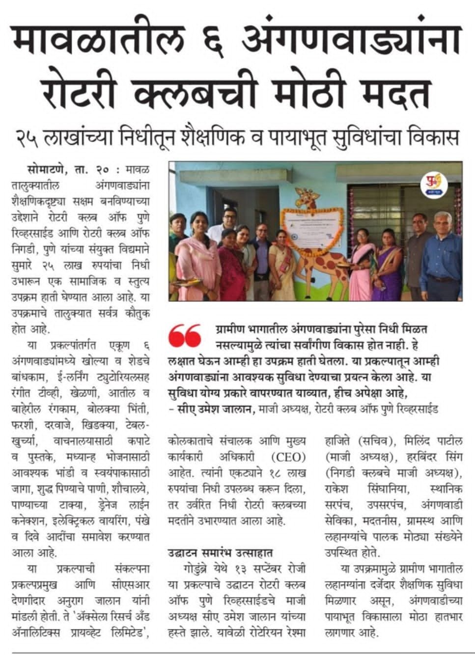 Support to 6 Anganwadis in Maval by Rotary Club* The Rotary Club of Nigdi, Pune and Rotary club of Pune Riverside have jointly undertaken a social and commendable initiative to enable Anganwadis in ...